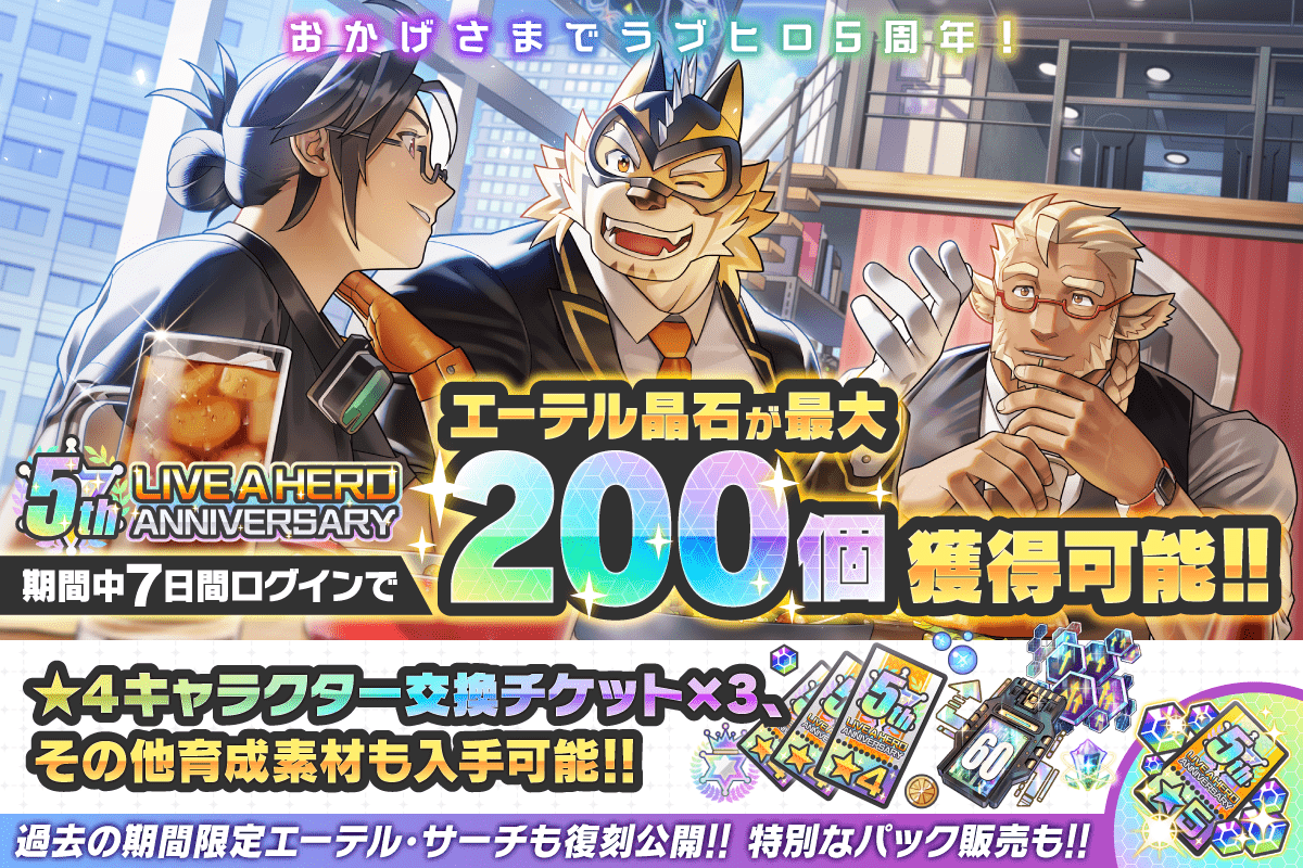 アプリ『LIVE A HERO -ライブ・ア・ヒーロー!-』を始めるチャンス! 5周年特別記念のキャンペーン&期間限定イベントがやってくる! ログインボーナスやキャラクター交換チケットなどの豪華報酬をゲットしよう!
