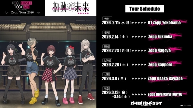 このたび、そのライブ終盤に『ガールズバンドクライ』完全新作映画製作決定をはじめ、「トゲナシトゲアリ Zepp Tour 2026 “拍動の未来”」開催決定、「トゲナシトゲアリ 4th ONE-MAN LIVE “協奏の響”」Blu-ray&DVD 発売決定、公式ゲーム「ガールズバンドクライ First Riff」ティザーPV公開、ラジオ新番組「トゲナシトゲアリのトゲラジ~川崎から世界へ~」放送開始といった重大情報が続々と解禁されました。