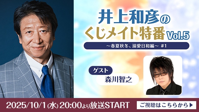 くじメイトの販売期間中に、井上和彦さんがMCをつとめる「【ゲスト:森川智之】井上和彦のくじメイト特番Vol.5 ~春夏秋冬、溺愛日和編~#1」がニコ生で配信されます!