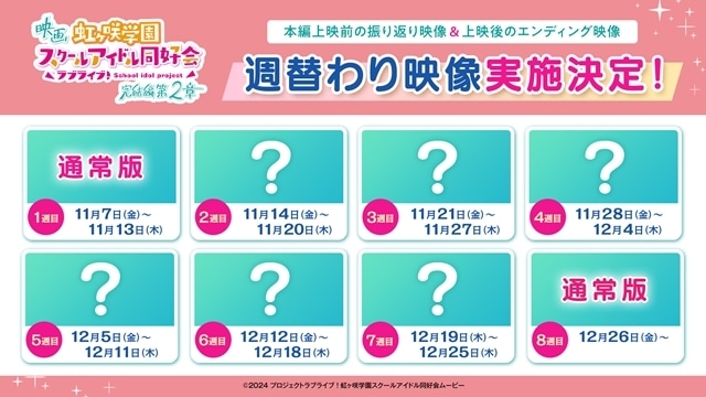 1週目・8週目以降は通常版(1種)を上映、2~7週目までは各週、週替わりバージョン(全6種)で上映されます!詳細は続報をお待ちください!