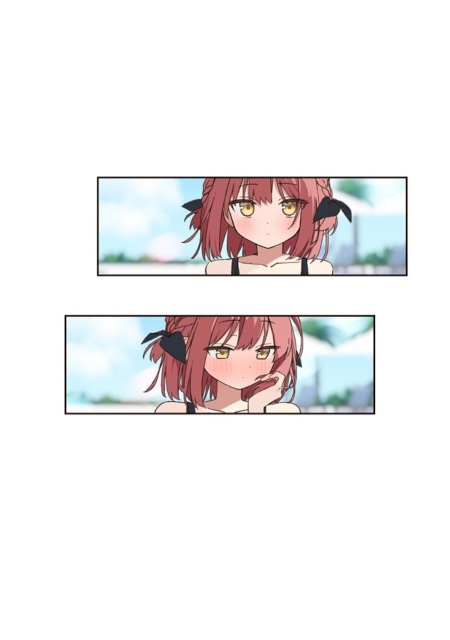 先輩のことを思って選んだ水着。けれど、いざ見つめられてしまうと恥ずかしくなってきたのか赤面してふいっと視線を逸らし、髪の毛をいじりながら照れるお姉ちゃんがかわいらしいです♪