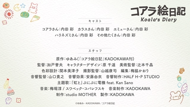 メインキャストはコアラさん役の内田彩さんが、カラスさん、エミューさん、ハリネズミさんをはじめとした『コアラ絵日記』の全てのキャラクターを1人で担当します。