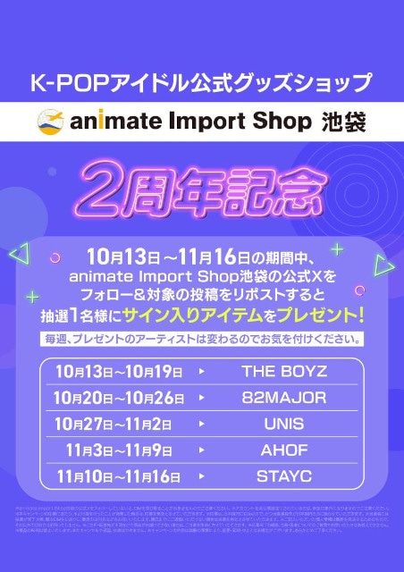 また、10月13日~11月16日には「animate Import Shop 池袋」公式Xでもキャンペーンを実施いたします。アカウントをフォロー&対象の投稿をリポストしていただいた方の中から抽選で毎週1名様に、K-POPアーティストの直筆サイン入りアルバムをプレゼントするので、こちらもお見逃しなく♪