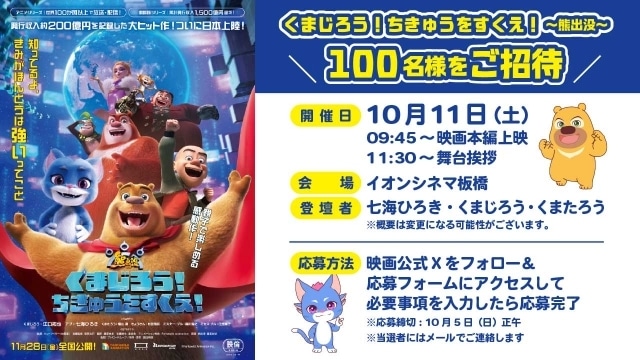 『くまじろう!ちきゅうをすくえ! ~熊出没~』(原題:「熊出没・ 重返地球」)は、原作がくまの兄弟と仲間たちが大活躍する大人気アニメ『熊出没』シリーズです。世界でも100以上の国と地域で放送・配信され、劇場版はシリーズ累計興行収入が約1500億円を超え毎回大ヒット!本作『くまじろう!ちきゅうをすくえ! ~熊出没~』も、興行収入約200億円を記録しています。(2025年6月時点のレート)