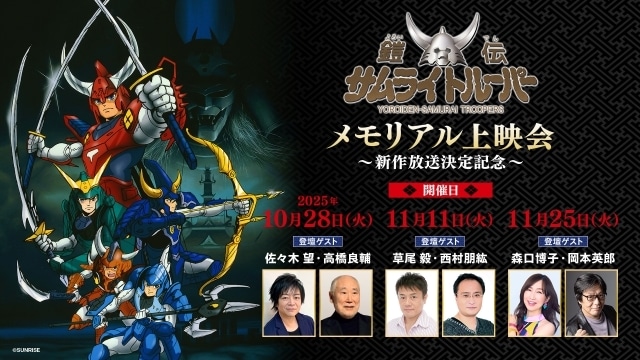 この度、10月28日(火) 、11月11日(火) 、11月25日(火)の3日間にわたって新宿ピカデリーで開催される『鎧伝サムライトルーパー』メモリアル上映会~新作放送決定記念~につきまして、各回で上映される、豪華登壇ゲストが旧作シリーズの中から厳選した上映話数がついに公開!