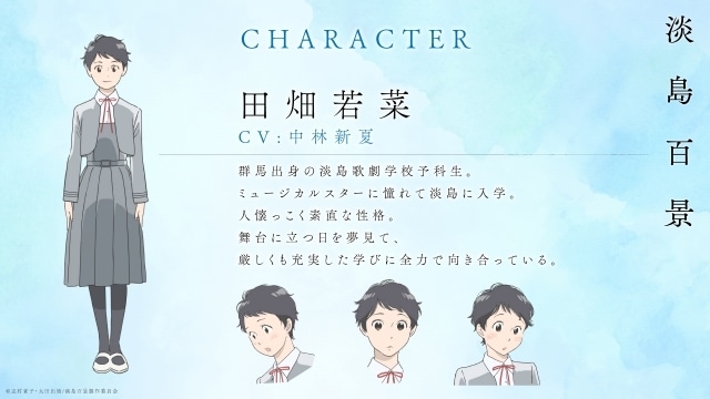 人懐っこく素直な性格で舞台に立つ日を夢見て淡島に入学した若菜。厳しくも充実した学びに全力で向き合う彼女の学校生活を描いたビジュアルとなっている。