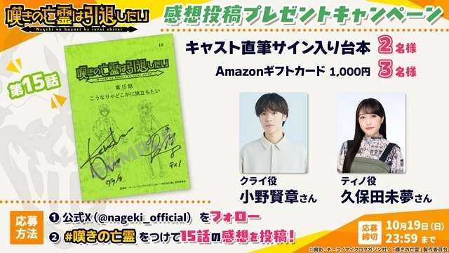 第15話の放送を記念して、小野賢章さん(クライ・アンドリヒ役)、久保田未夢さん(ティノ・シェイド役)の直筆サイン入り台本やAmazonギフトカード1,000円分が当たるキャンペーンを開催します。