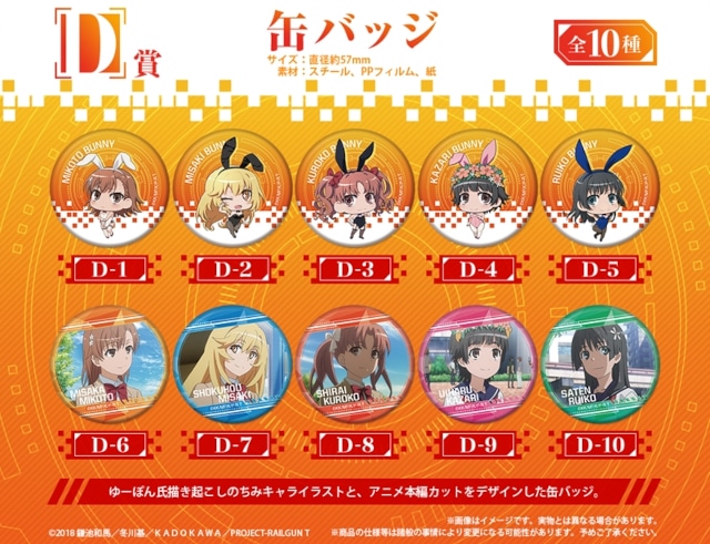 ロングタペストリー、アクリルスタンド、アクリルキーホルダー、缶バッジの中から、ハズレなしで必ずいずれかが当たります。中には、バニーガール姿の御坂美琴・食蜂操祈の描き下ろしイラストや、人気イラストレーター・ゆーぽん氏描き起こしイラストを使用したアイテムも!!
