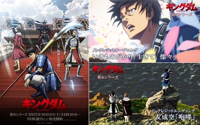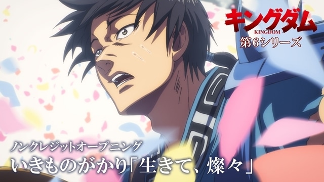 オープニングムービーでは第6シリーズに登場するキャラクターが勢揃い。戦場を駆ける信の背中には、その背に夢を託した王騎や麃公、そして漂の姿が。王騎の矛、そして麃公の盾を手にし、先人たちの遺志と仲間との誓いを胸に、燦然と輝きながら前へ進んでいく信の生き様を、いきものがかりが歌う「生きて、燦々」(楽曲配信リンク:https://erj.lnk.to/o46g48)が熱く彩ります。