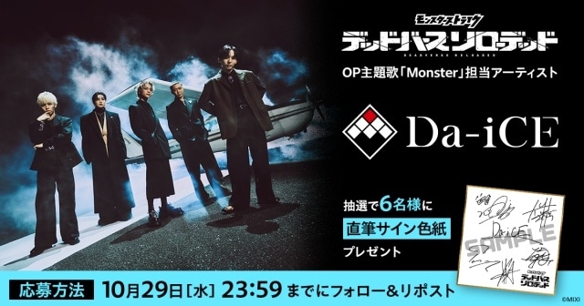 アニメ「モンスターストライク デッドバースリローデッド」第1話の放送を記念して、オープニング主題歌を担当する Da-iCE のサイン色紙が抽選で当たるキャンペーンを 10 月 23 日(木)12:00 より開催します。