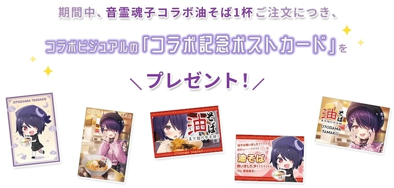 期間中、音霊魂子コラボ油そば1杯ご注文につき、コラボビジュアルの「コラボ記念ポストカード」をプレゼント!