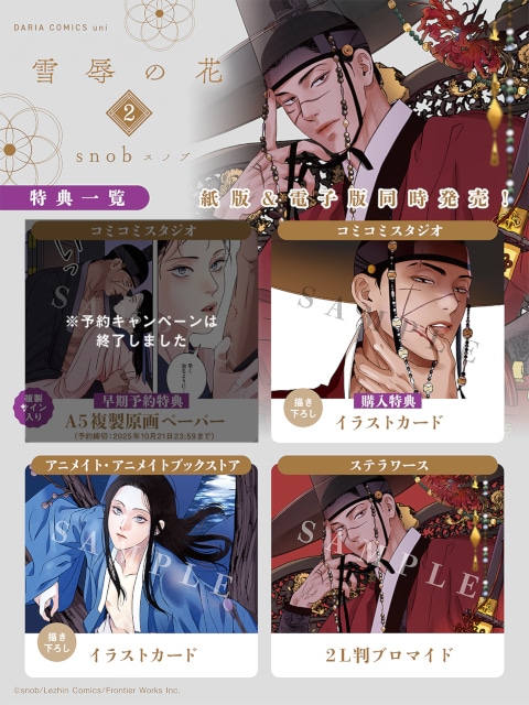 snob先生によるBL漫画『雪辱の花』第2巻が、紙&電子書籍にて10月22日より発売中! アニメイト・アニメイトブックストアにて購入すると、特典として「描き下ろしイラストカード」がもらえます。