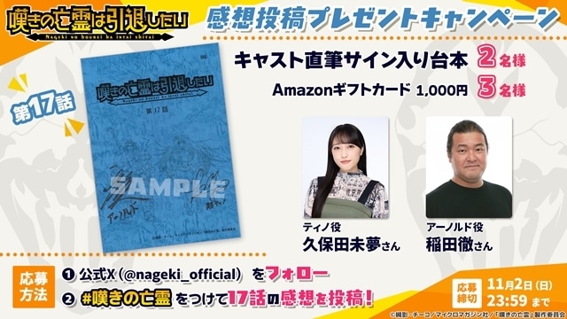 第17話の放送を記念して、久保田未夢さん(ティノ・シェイド役)、稲田徹さん(アーノルド・ヘイル役)の直筆サイン入り台本やAmazonギフトカード1,000円分が当たるキャンペーンを開催します。