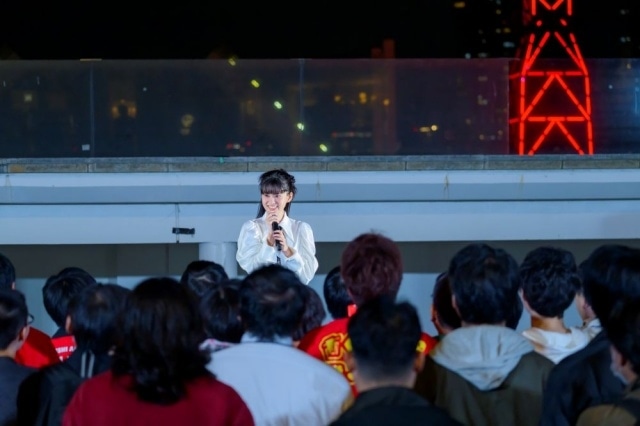 陽が沈み、辺りも暗くなった17時半。大西亜玖璃がステージに立つと、いつもより控えめな声援が送られる。というのも会場にデシベル制限があったからなのだが、彼女の普段のライブは、ファンの声がかなり大きいので、この日は、全体的に声のボリュームを抑えてのステージとなった。