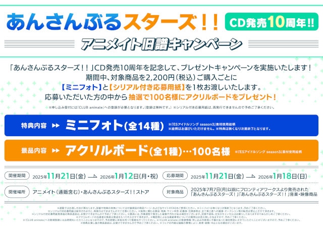 CD発売10周年を記念して、抽選で「特製B5アクリルボード(あんさんぶるスターズ!! ESアイドルソングseason3絵柄)」(全1種)が当たるX投稿キャンペーンを実施します!