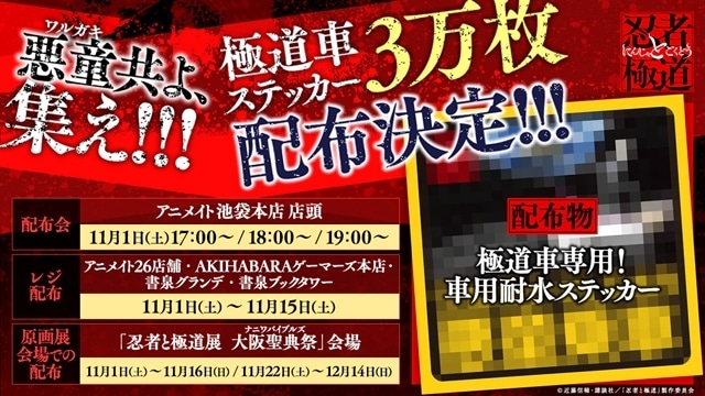 アニメイト26店舗・AKIHABARAゲーマーズ本店・書泉グランデ・書泉ブックタワーでの配布のほか、11月1日(土)にアニメイト池袋本店での配布会も開催! さらに、原作コミックスの原画展「忍者と極道展 大阪聖典祭(ナニワバイブルズ)」会場でも配布します。
