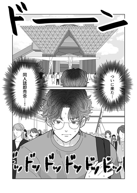 女性ばかりのBL界隈で、今までは直接イベント会場に行く事を躊躇していた田中。推し作家「たまもち」が参加する、しかも売り子が男性であることに勇気づけられ、新刊を買いに初めて会場に向かいます。