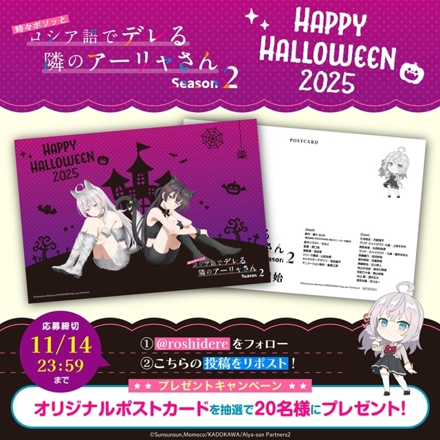 そしてハロウィンビジュアル公開を記念して、ハロウィンビジュアルを使用したポストカードのプレゼントキャンペーンを作品公式Xにて実施! また、アーリャの誕生日を記念して11月7日(金)20:00より、天﨑滉平さん(久世政近役) 、上坂すみれさん(アーリャ役)、丸岡和佳奈さん(周防有希役)、藤井ゆきよさん(マーシャ役)、会沢紗弥さん(君嶋綾乃役)が出演する特番「アーリャ生誕祭2025生徒会SP」の公開も決定しました。