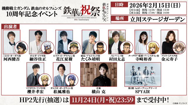 2026年2月15日(日)に立川ステージガーデンにて行われる、『機動戦士ガンダム 鉄血のオルフェンズ』10周年記念プロジェクトのフィナーレイベント「機動戦士ガンダム 鉄血のオルフェンズ 10周年記念イベント -鉄華の祝祭-」のチケット2次先行受付中!