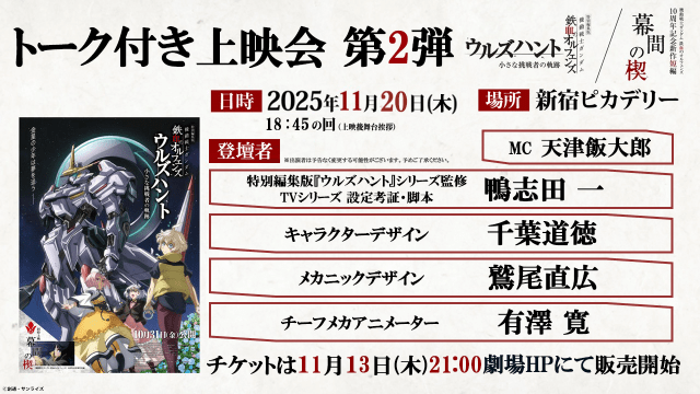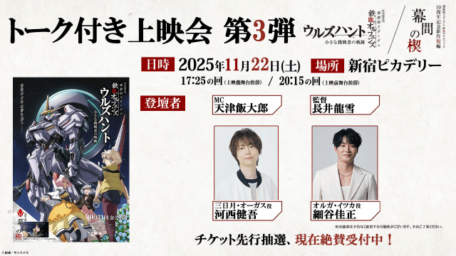 登壇の「トーク付き上映会 第2弾」、そして11月22日(土)に長井龍雪監督、三日月役・河西健吾さん、オルガ役・細谷佳正さん登壇の「トーク付き上映会 第3弾」を開催予定!トーク付き上映会の最後の回となる11月22日(土)実施の第3弾は、一足早くチケットぴあにてプレリザーブ抽選を受付中。第2弾のチケットは、11月13日(木)21時より、劇場HPにて販売スタートとなりますので、是非お越しください!
