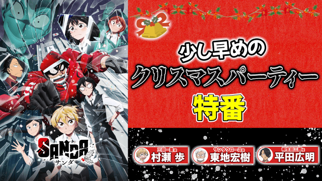 村瀬歩(三田一重役)、東地宏樹(サンタクロース役)、平田広明(柳生田三郎役)が出演し、すこし早いクリスマスパーティーを楽しみつつ、これまでの展開の振り返りや、今後の展望についてを熱く語ります! さらに、第7話より登場する新キャラクターの解禁も…!『SANDA』をまだご覧になっていない方も、特番を見ればすぐに追いつきます!ぜひご覧ください!