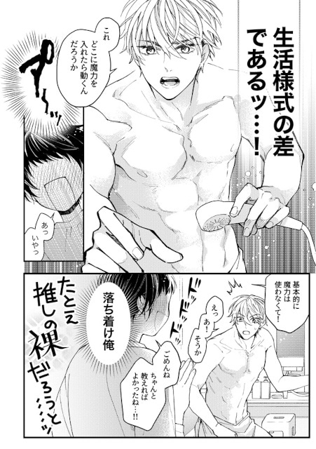 もちろん、お洋服も現代に合わせなければいけないわけで……。筋肉たくましい騎士団長のレイは、スバルのお洋服を貸してもパツパツ。一般男子の服ではもう……とても大変な見目になってしまうのです。こちらぜひ作品内でご高覧ください!