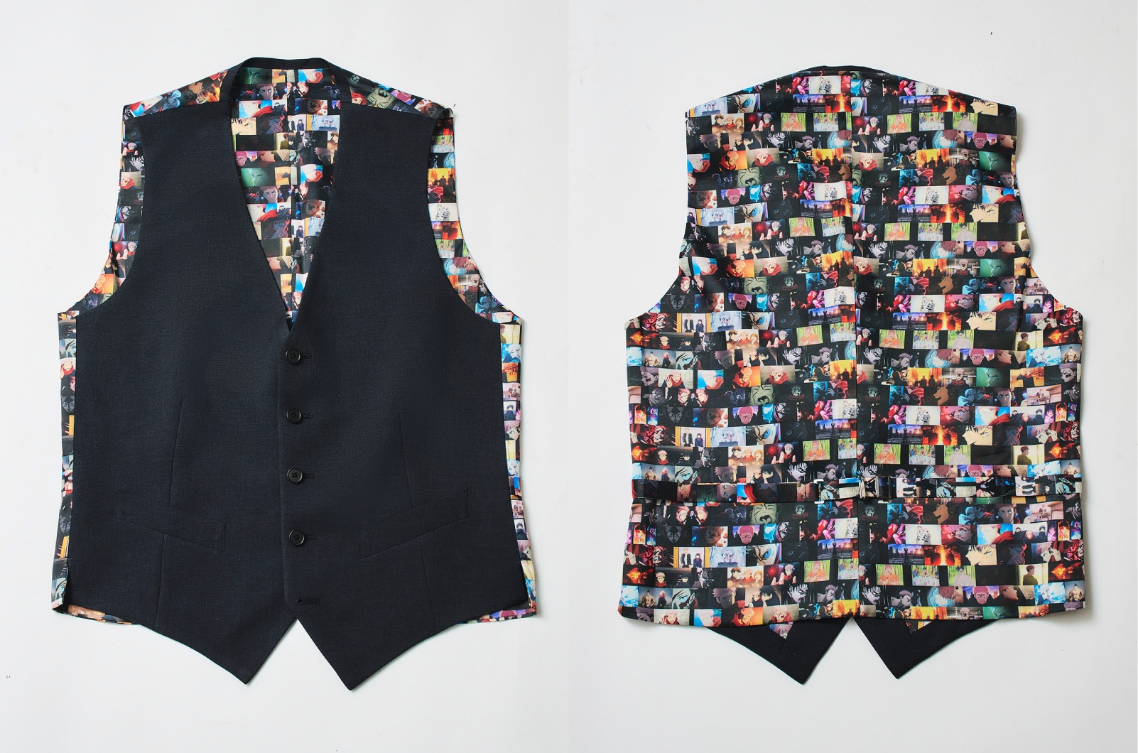 ベストの背中側(背裏)には、スーツ裏地と共通の3種類(虎杖、七海、五条)のシーンを、全面にわたり派手に配します。