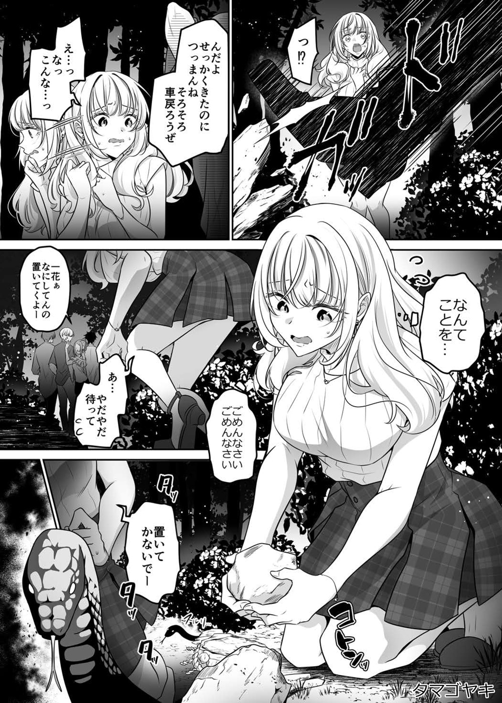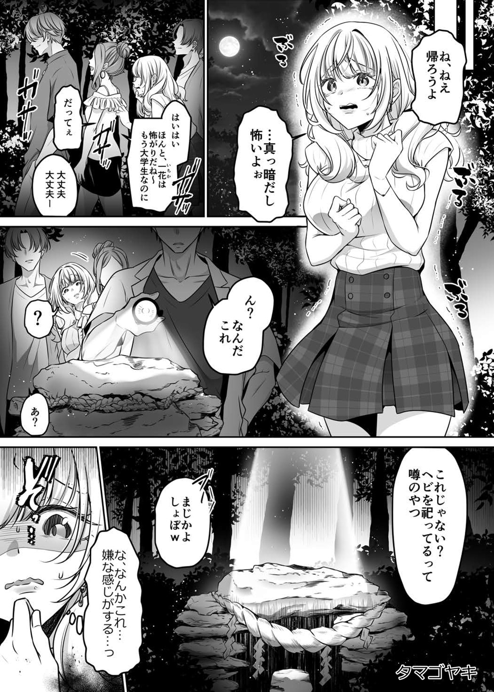 やがて彼らはヘビを祀っているという噂の石の祠を発見する。嫌な気配を覚える一花とは違い、友人たちは皆、思っていたよりも出来の悪い祠に落胆。さらにそのうちの1人が「せっかくきたのにつっまんね」と言って祠を蹴り壊し、その場を立ち去ってしまう。