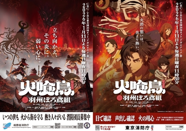 今村翔吾先生による小説を原作としたアニメ『火喰鳥 羽州ぼろ鳶組』が、2026年1月11日(日)よりCBC/TBS系全国28局ネット「アガルアニメ」枠(日曜夜11時30分〜)にて放送されることが決定。