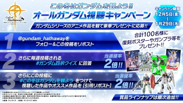 各種配信サービスなどでガンダムシリーズのアニメ本編をご視聴のうえキャンペーンにご応募いただいた方の名から、抽選で合計100名様に復刻ポスターやガンプラなど豪華プレゼントが当たるチャンスとなっています。締切は1月29日(木)まで。ぜひご参加ください。