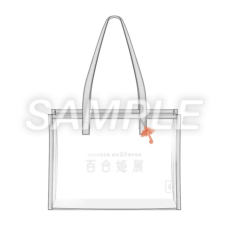 百合姫展ロゴのトートバック。赤い傘のチャームがついた儚い透け感を楽しめる、ビニールバッグです。