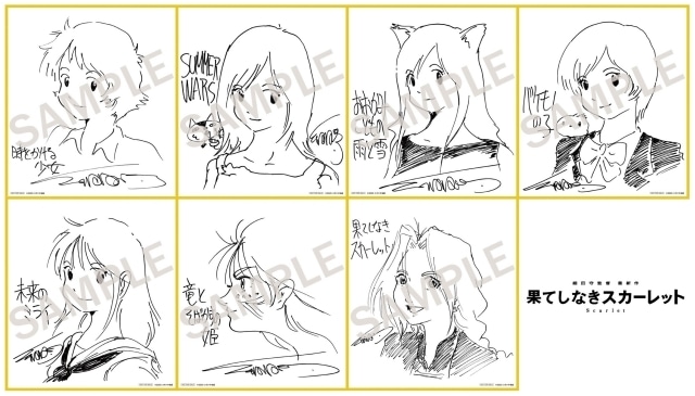 ミニ色紙には『時をかける少女』の真琴、『サマーウォーズ』の夏希先輩、『おおかみこどもの雨と雪』の雪、『バケモノの子』の楓、『未来のミライ』のミライちゃん、『竜とそばかすの姫』のベル、そして『果てしなきスカーレット』のスカーレットと、これまでたくさんの観客を魅了してきた各作品のヒロインが生き生きと描かれています。