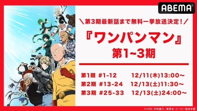 「ABEMA」にて『ワンパンマン』第1期・第2期全話と第3期最新話までの振り返り無料一挙放送が決定!