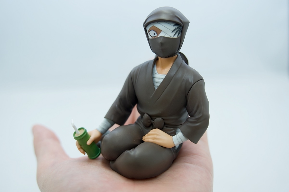そんな作中最強とも言える雑渡昆奈門が“てのひら雑渡さん”に。タソガレドキ忍軍の忍び装束、顔や体に巻かれた包帯も忠実に再現。あぐらをかく利吉に対して、雑渡さんはお馴染みの“横座り”です。