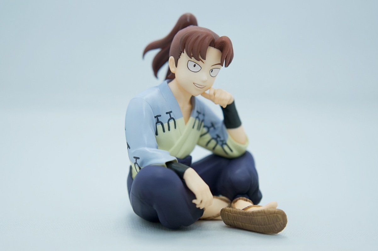 ▲顎と頬に添える左手の親指と人差し指の角度、自身の脚に乗せた右手の仕草。こちらに視線を向けながら何やら思案しているような利吉らしい姿です。この角度から捉える、利発そうな表情やポニーテールの躍動感もイチオシ!