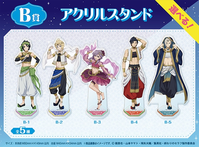 B2タペストリー、アクリルスタンド、スクエアミラー、アクリルキーホルダー、缶バッジといった景品の中から、必ずいずれかが当たります。すべてのアイテムに、描き下ろしイラストを使用している豪華仕様です!