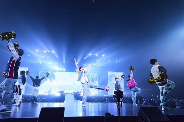 ジャケットを羽織った宮野は、軽快なステップと共に歌った「Sea Tide」、ファンキーに迫る「WANNA LOVE」、レゲトンEDM化したアレンジでアクティブに魅せた「Magic」、ダンサーと共に花道を進み記念写真を撮影する演出もあった「Uhh」と続け、メドレーラストの「Splash Blue」ではジャケットとシャツを大胆にはだけて逞しい上半身を露わにし、客席から黄色い歓声を引き出した。