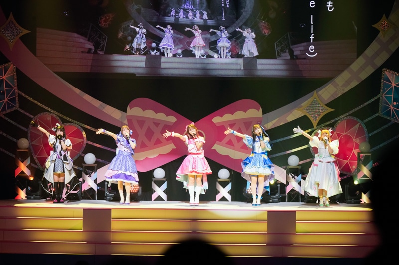 6曲を歌い終えると、ステージには声優キャスト陣とオープニング主題歌歌手が再び集結。オープニング主題歌歌手3人はこの日のために用意されたライブ仕様の衣装へとチェンジし、客席から、さらに声優キャストからも「かわいい〜!」と歓声が上がりました。