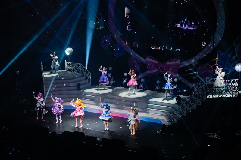 声優キャスト陣の華やかな衣装にも思わず目が奪われます。これまではそれぞれが演じるプリキュアのイメージを取り入れた衣装が中心でしたが、今回は“プリキュアそのもの”を感じさせるデザインに。なお、音符やリボンがちりばめられた『キミプリ』仕様のステージには、左右に階段が設けられており、この高低差を活かしたカメラワークも見どころのひとつ。モニターに映し出される配信映像では、プリキュアとキャストが同じ視界に収まるカットも多く、“プリキュアと声優キャストがふたりでひとつ”の存在であることを改めて感じました。また、配信では“全景”ショットへ切り替わるスイッチングのおかげで、会場全体をしっかりと味わえたのも嬉しいポイントでした。