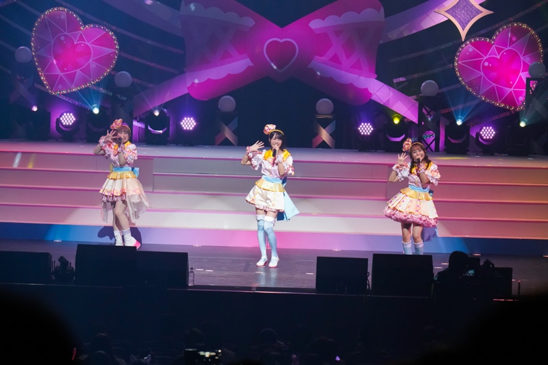 オープニング映像を経て、おそろいのカチューシャをつけた石井さん、熊田さん、吉武さんが『キミプリ』シンガー衣装でオンステージ。『キミプリ』オープニング主題歌「キミとアイドルプリキュア♪ Light Up!」で序盤からハイライトと呼べるような大きなコール&レスポンスとハンズクラップを巻き起こし、きらめき満開のステージを立ち上げていきます。