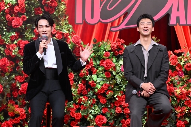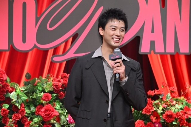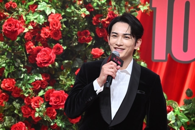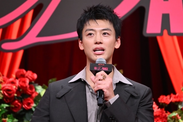 本予告映像が190万回再生(12月17日時点)を突破し、配信前から大きな話題を集めているNetflix映画『10DANCE』。配信開始を翌日に控えたこの日、W主演の竹内涼真と町田啓太、そして監督を務めた大友啓史が登壇する配信記念イベントが開催された。作品にちなみ、情熱的に燃え盛る深紅の花々と赤いベルベットに包まれたラグジュアリーなステージに登場した3人。