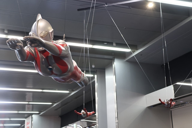 また、展示は地上だけにあらず。視線を上げてみると、そこにはウルトラマン、ウルトラセブン、ウルトラマンタロウの飛び人形(飛行ポーズのフィギュア)が。ぜひ、会場の隅々まで楽しもう。