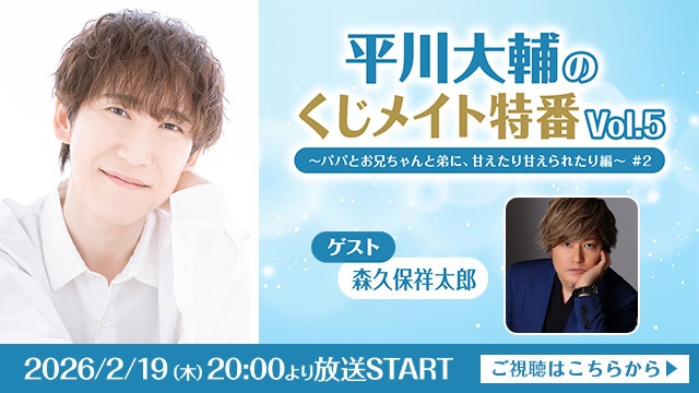 くじメイトの販売期間中に平川大輔さんがMCをつとめる「【ゲスト:森久保祥太郎】平川大輔のくじメイト特番Vol.5 ~パパとお兄ちゃんと弟に、甘えたり甘えられたり編~#2」がニコ生で配信されます!
