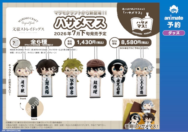 マリモクラフトの新グッズ「ハサメマス」より、『文豪ストレイドッグス』が2026年7月下旬に発売予定! ラインナップは中島 敦、太宰 治など6人。文豪の名を懐く者たちだけに、“本にはさめるマスコット”というこの商品にピッタリです!
