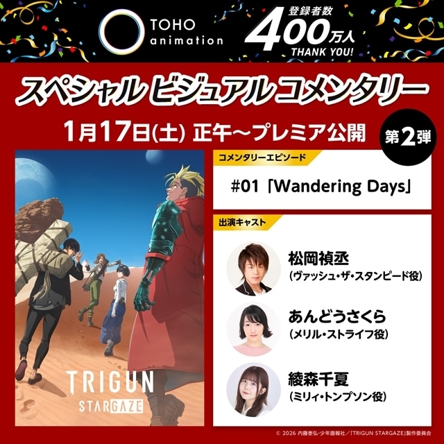 TOHO animation YouTubeチャンネルの登録者数400万人突破を記念して行われてるビジュアルコメンタリー企画第2弾として、『TRIGUN STARGAZE』第1話「Wandering Days」の公開が決定。