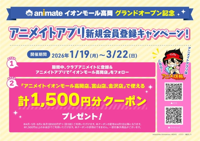 1)期間中、クラブアニメイトに登録&アニメイトアプリで「イオンモール高岡店」をフォロー。