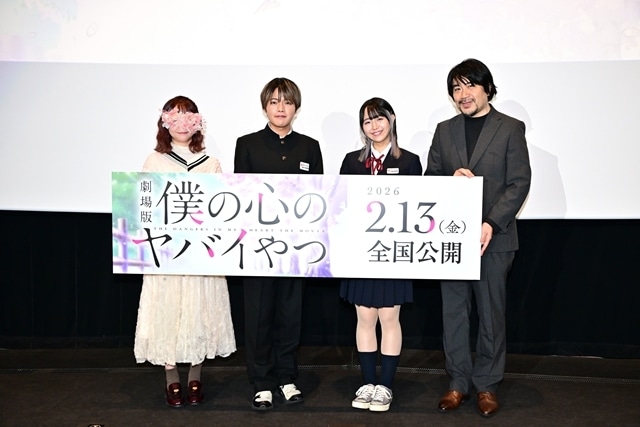 海外アワードも多数受賞した、青春初恋ラブコメがついにスクリーンへ!劇場版「僕の心のヤバイやつ」完成披露舞台挨拶が1月17日に新宿バルト9にて実施され、声優の堀江瞬、羊宮妃那、そして赤城博昭総監督にくわえ、TVアニメ1期&2期のEDテーマを担当したこはならむがサプライズで登壇した。