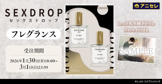 2026年5月に発売を予定している『セックスドロップ』のフレグランスは、黒木鎮と黄海知昭をそれぞれイメージした2本セットで、しっけ先生描き下ろしブロマイド付きです。全国アニメイト・アニメイト通販にて2026年3月1日まで受注受付を行っております。