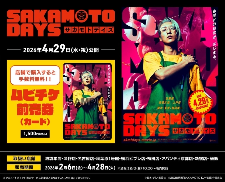 超絶バトルアクション大人気漫画実写映画化!映画『SAKAMOTO DAYS』2026年4月29日(水・祝)公開!アニメイト対象店舗・通販でムビチケカードが発売中!