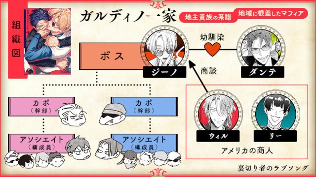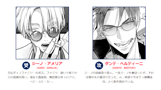 ボス・ジーノと下っ端構成員のダンテは部下たちには秘密の恋人同士。こっそりと甘い時間を過ごす日々だ。